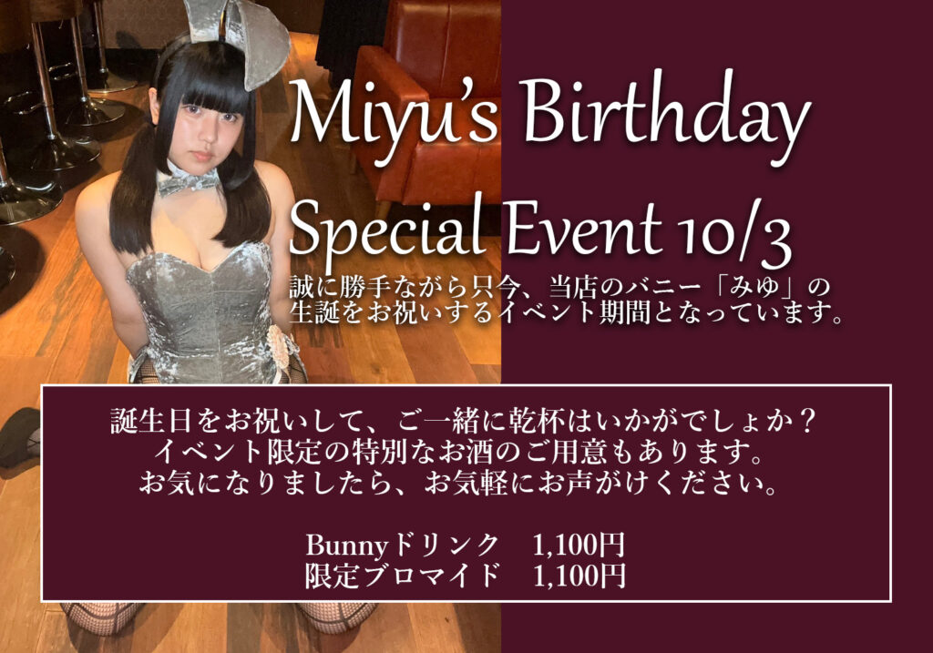 秋葉原のガールズバー「BunnyPalace(バニーパレス)」では、10月3日に、みゆ生誕イベントを実施します。