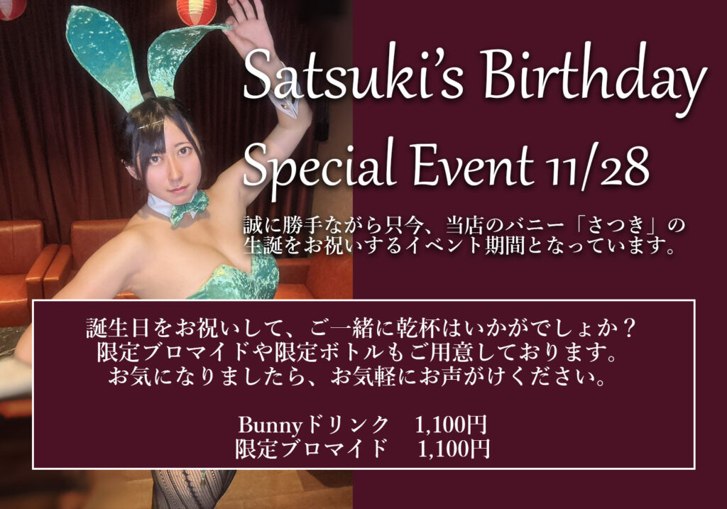秋葉原のガールズバー「BunnyPalace(バニーパレス)」では、11月28日に、さつき生誕イベントを実施します。