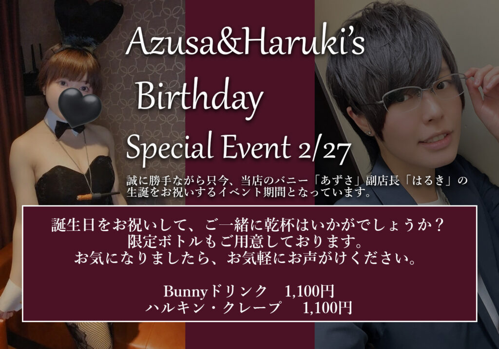 秋葉原のガールズバー「BunnyPalace(バニーパレス)」では、2月27日に、あずさ、はるき生誕イベントを実施します。